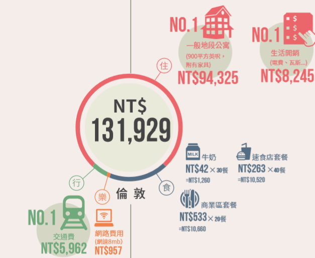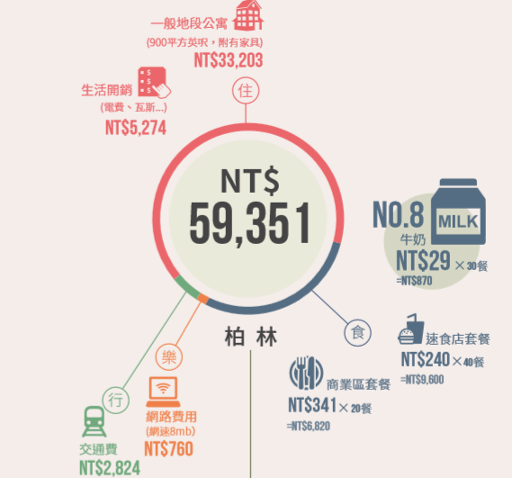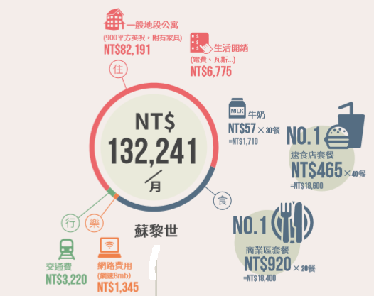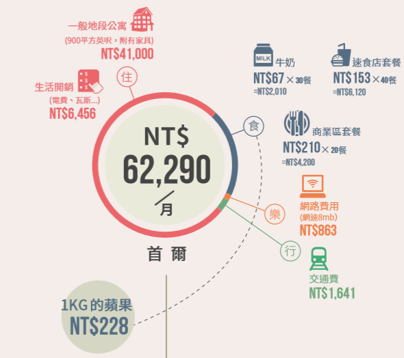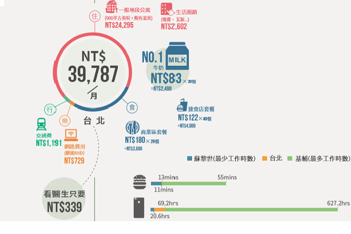 以瑞士銀行2015年的《物價與收入》(Price & Earnings)研究報告來看,台北平均工作13分鐘可以買一個大麥克,工作69.2小時買得起一隻iPhone6手機,台北的工作時數和瑞士相比多了3倍,與薪資最低的基輔相比則少了9倍。
