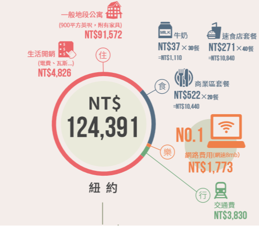 住在紐約市的成本與美國其他城市相比,平均高出68.8%,紐約的房價、運輸(停車費、汽油、維修保養)、食物、娛樂都貴得驚人,曼哈頓的一間兩房公寓每月平均租金約3895美元。