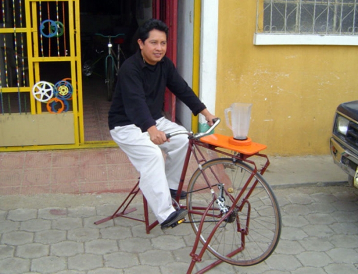 乍看之下,「單車磨坊」(Bicidesgranadora) 的外型和健身房裡常見的「飛輪」十分神似。不同的是,踩動時,鏈條會牽動一旁的碎磨裝置,以每分鐘3 磅的速度研磨玉米粒,一天下來就能產出300磅的玉米粉。同樣的原理,Bicimáquinas 還有抽水、去殼、攪拌、洗衣等不 同設計,幾乎想得到的日常生活瑣事,都可以靠它完成。