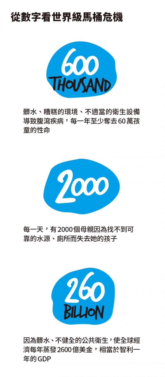 聯合國估計,世界上至少有25億人沒有辦法使用廁所,150萬孩童因為喝到沒有適當處理過的污水而腹瀉死亡,而全世界的女性裡,每三人就會有一人冒著羞愧、生病、被騷擾、甚至被攻擊的風險,只因為找不到廁所。