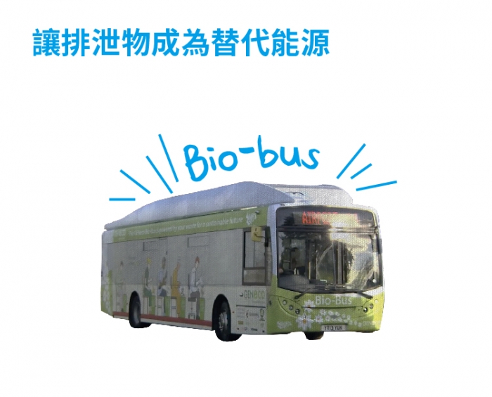 由GENeco Sustainable Solutions協助、英國第一集團運輸公司(First West of England)2015年首度開出第一班用排泄物驅動的公車(Bio-bus)。它的原理是當微生物在厭氧環境下分解轉化(anaerobic digestion)廚餘及排泄物時,可產出有機物質生物甲皖(biomethane gas)作為驅動能源。一個乘客一年的廚餘、排泄物可讓公車行駛60公里,二氧化碳排放量比傳統汽柴油車少了30%。
