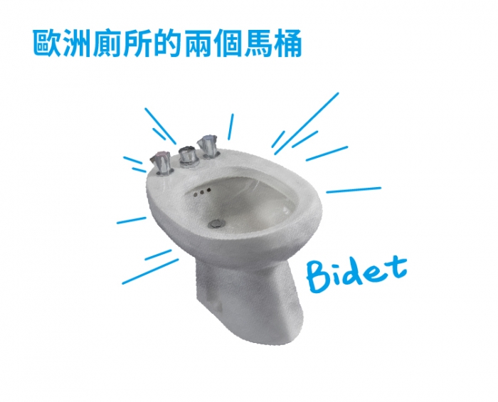 歐洲許多國家的廁所除了馬桶與洗手台外,還附有一個專門清洗下半身的水槽,稱為「Bidet」,法文原意為「騎馬」,只要坐上去調節水溫、強度,就可以輕鬆在如廁後清洗屁股。據說Bidet在17世紀從法國傳開,現今流行於南歐及中南美洲。