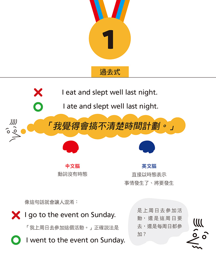 你可能會在這裡面看到似曾相似的錯誤。有些錯誤像過去式,明明知道要變化動詞,但腦子想到了,嘴巴未必做到。有些錯誤是連想也沒想到,有人告訴你才會發現自己錯了。