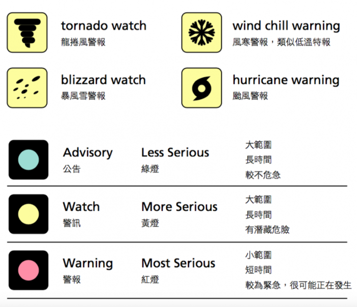 都是警訊 warning、watch、advisory 差別在哪 國外在發布氣象警報的「警報」,在不同階段與危險程度,會用上不同的詞。
