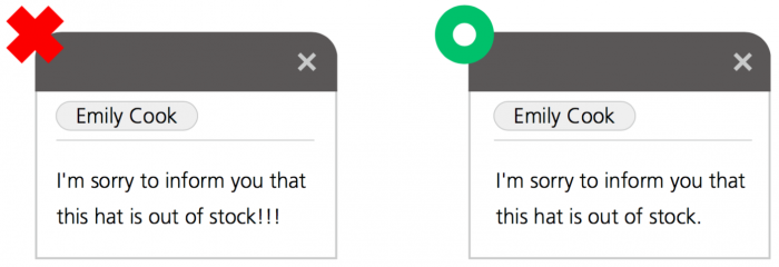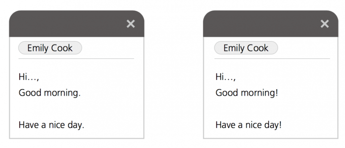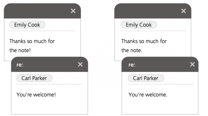 文書寫的狀況就是商業 Email。考慮到 Email 難以表達情緒,無法像面對面說話展現熱情,不少人便習慣在 email 裡使用大量驚嘆號,想讓語氣聽起來更積極、更友善。太多驚嘆號其實會造成反效果,反映寫信的人可能不正經。