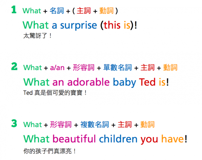 what是形容詞,接名詞。以下三種句型結構一樣,只是第二、三種句型多了形容詞及單數複數差異。