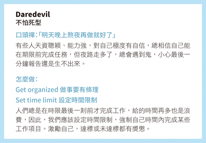 有些人天資聰穎、能力強,對自己極度有自信,總相信自己能在期限前完成任務,但夜路走多了,總會遇到鬼,小心最後一分鐘報告還是生不出來。