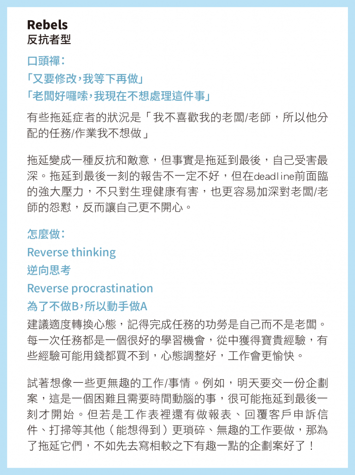 拖延變成一種反抗和敵意,但事實是拖延到最後,自己受害最深。拖延到最後一刻的報告不一定不好,但在deadline前面臨的強大壓力,不只對生理健康有害,也更容易加深對老闆/老師的怨懟,反而讓自己更不開心。