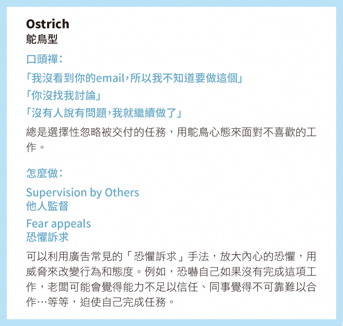 總是選擇性忽略被交付的任務,用鴕鳥心態來面對不喜歡的工作。