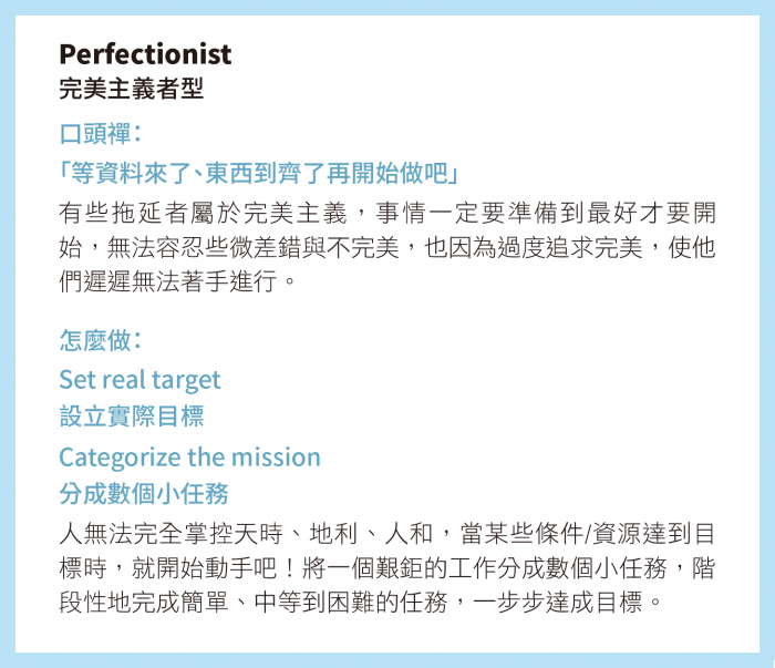 有些拖延者屬於完美主義,事情一定要準備到最好才要開始,無法容忍些微差錯與不完美,也因為過度追求完美,使他們遲遲無法著手進行。