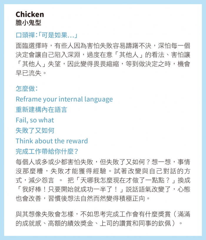 面臨選擇時,有些人因為害怕失敗容易躊躇不決,深怕每一個決定會讓自己陷入深淵,過度在意「其他人」的看法、害怕讓「其他人」失望,因此變得畏畏縮縮,等到做決定之時,機會早已流失。
